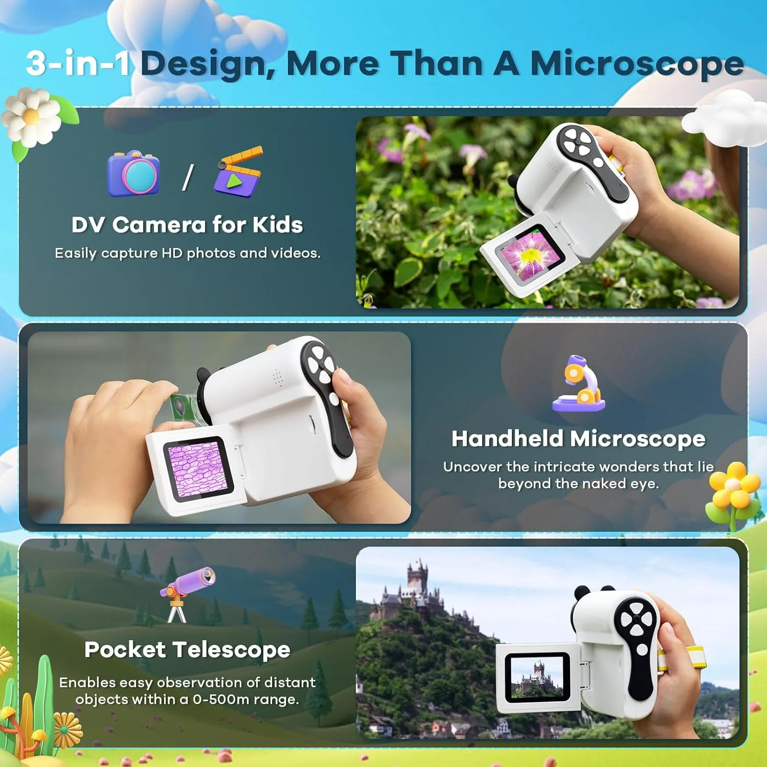 3-in-1 Explorer: Hideal HP60 kids microscope works as a handheld microscope, DV camera, and pocket telescope - the ultimate tool for young scientists! Examine tiny specimens, capture close-up videos of tiny living things, or observe distant objects. This compact all-in-one design makes outdoor exploration and science learning effortless and fun