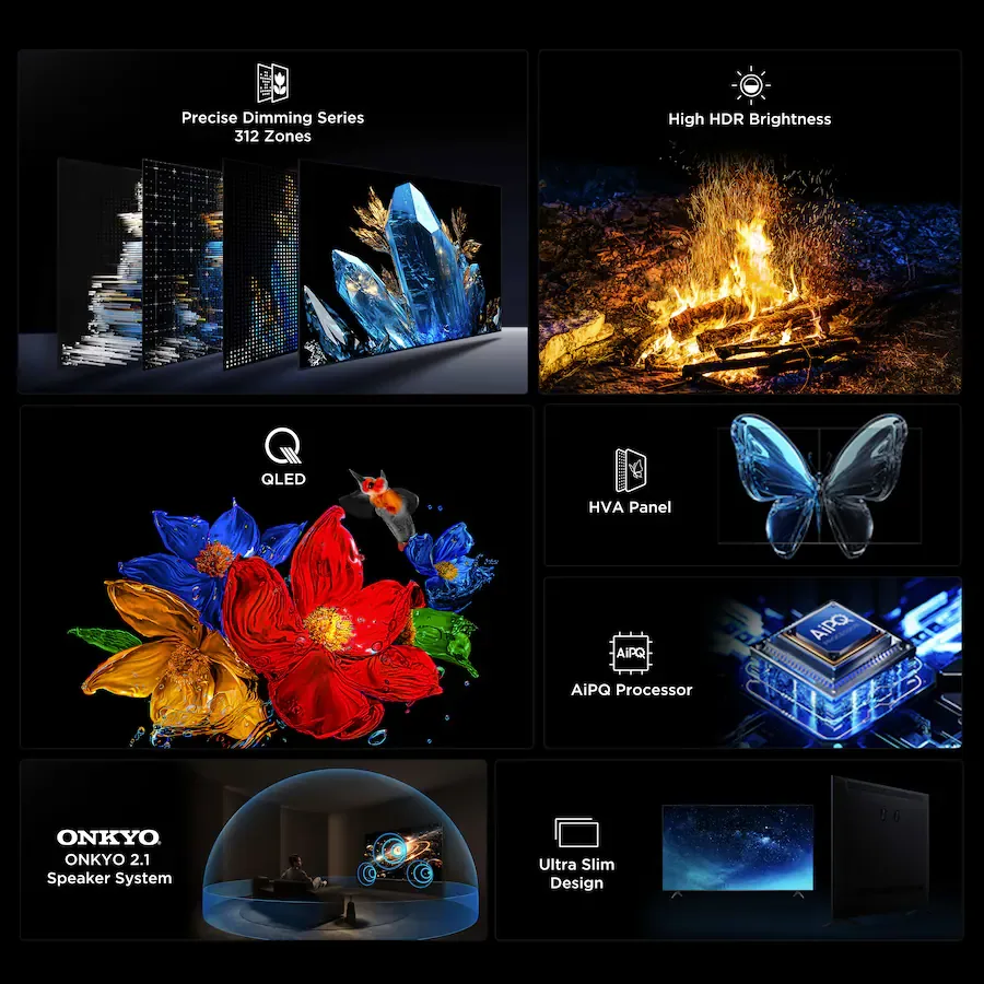 TCL QM5K Series Smart TV, The New Definition of Affordable Premium, is ideal for fast action movies, sports, and next level gaming TCL’s Halo Control System that includes the New Super High Energy LED Microchip, Condensed Micro Lens, Micro OD Reduced Optical Distance, High Contrast HVA Panel, Enhanced QLED, Zero Delay Transient Response, Bi-direction 23-bit Backlight Controller, and Dynamic Light Algorithm for Stunning “Halo-Free” Images. With Up to LD500 Precise Dimming Series and High HDR Brightness, you’ll experience pure black levels and a great picture in virtually any room lighting environment. TCL's AIPQ Processor, an advanced processor optimizing each scene with machine learning, provides an unrivaled cinematic experience. Motion Rate 240 provides smooth video playback and with TCL's Game Accelerator 144 and Auto Game Mode, gameplay is blistering fast, keeping you ahead of the competition. TCL QM5K TVs feature Dolby Atmos, DTS Virtual:X, and an Onkyo 2.1 speaker system with a built-in subwoofer for high performance spatial sound