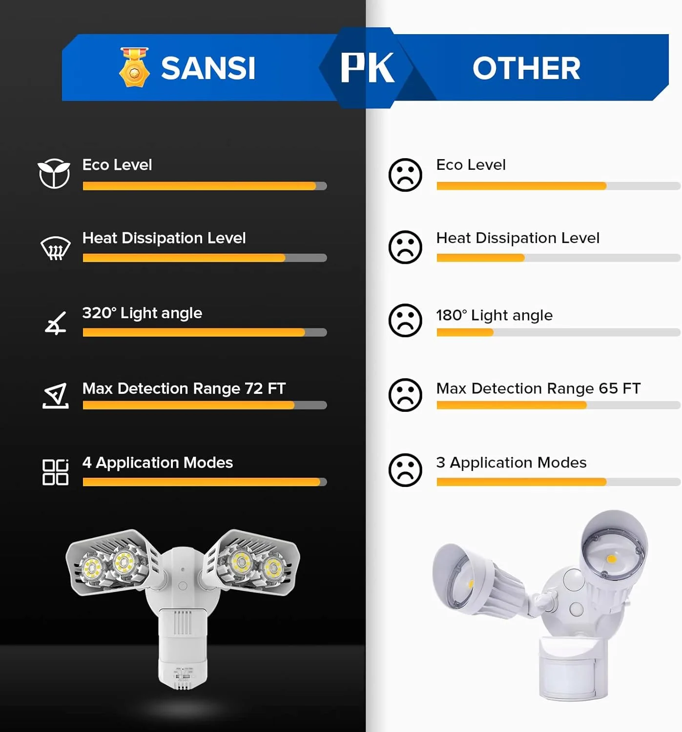 Energy Saving: The Eco-Series motion sensor outdoor light with the output of 18 Watts, 1800 Lumen, saves more than 90 percent on electricity bill and reduces 80 percent carbon emission compared with 200W equivalent traditional halogen lights. Adopted with the SANSI independently designed drive power of IC chip, light efficiency is greatly improved.