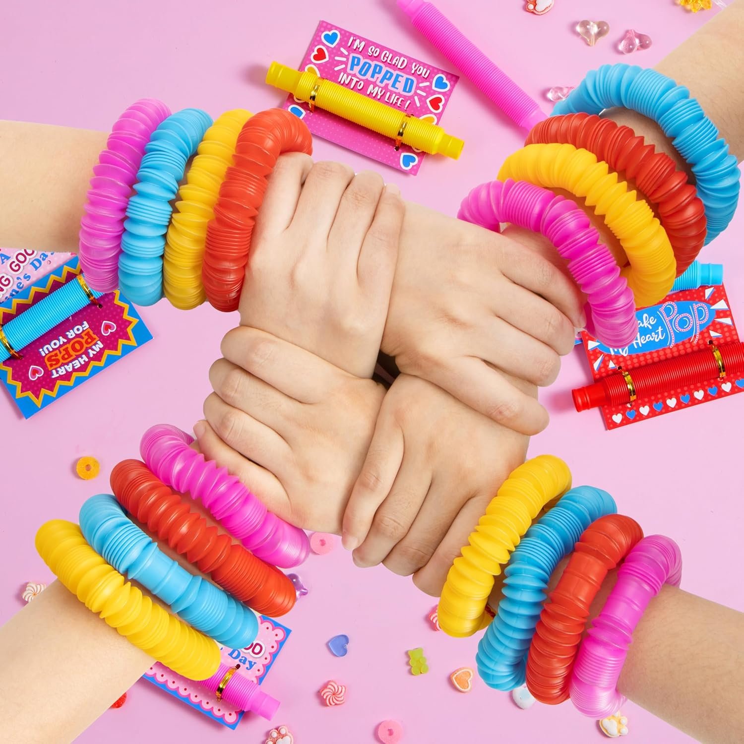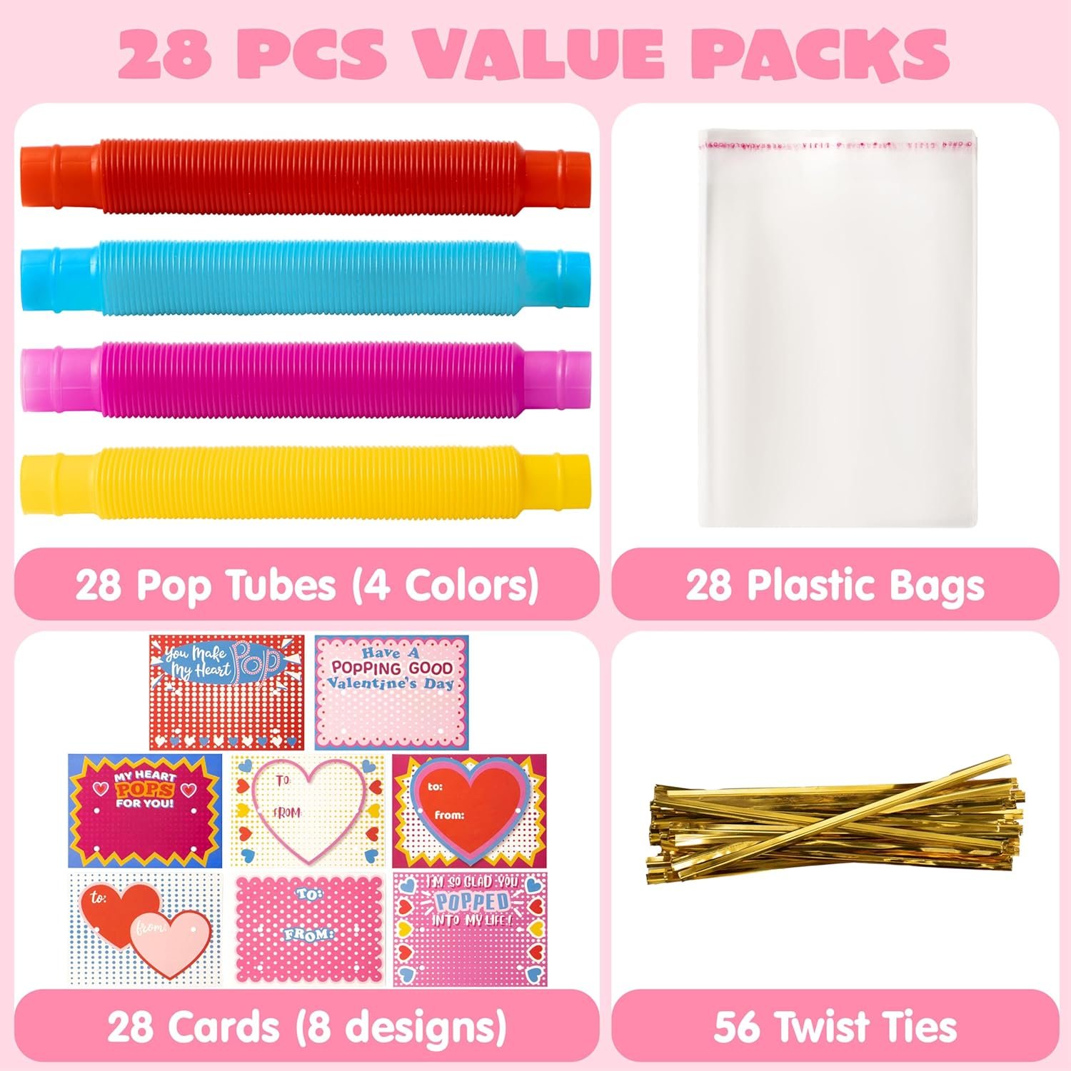 SUPER VALUE PACK. Our Valentine’s Day Cards Popping Tube Set includes 28 pop tube fidget toys and 28 valentine’s cards with cute, humorous messages that uniquely match the theme of the toys.
