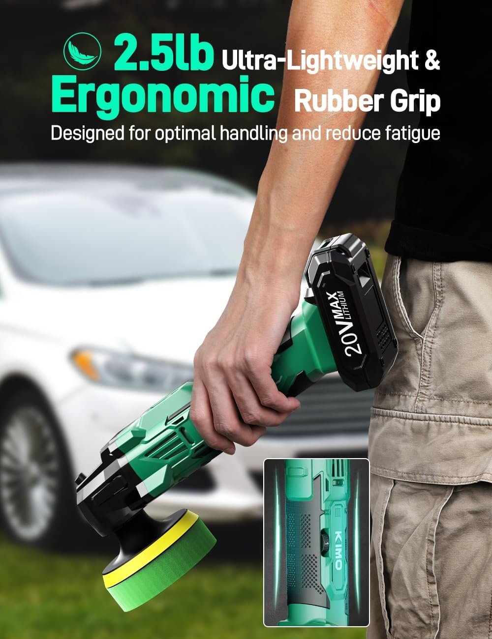Advanced Brushless Motor Enhances 200% Efficiency KIMO battery powered buffer polisher redesigned brushless motor delivers 200% conversion efficiency with zero wear, it offers unparalleled durability--ensuring longer runtime, cooler operation, and ultra-durable performance. KIMO car polishers and buffers cordless design eliminates cords for unmatched mobility and precision. Perfect for pros and beginners who want powerful, reliable, and truly wireless polishing freedom.