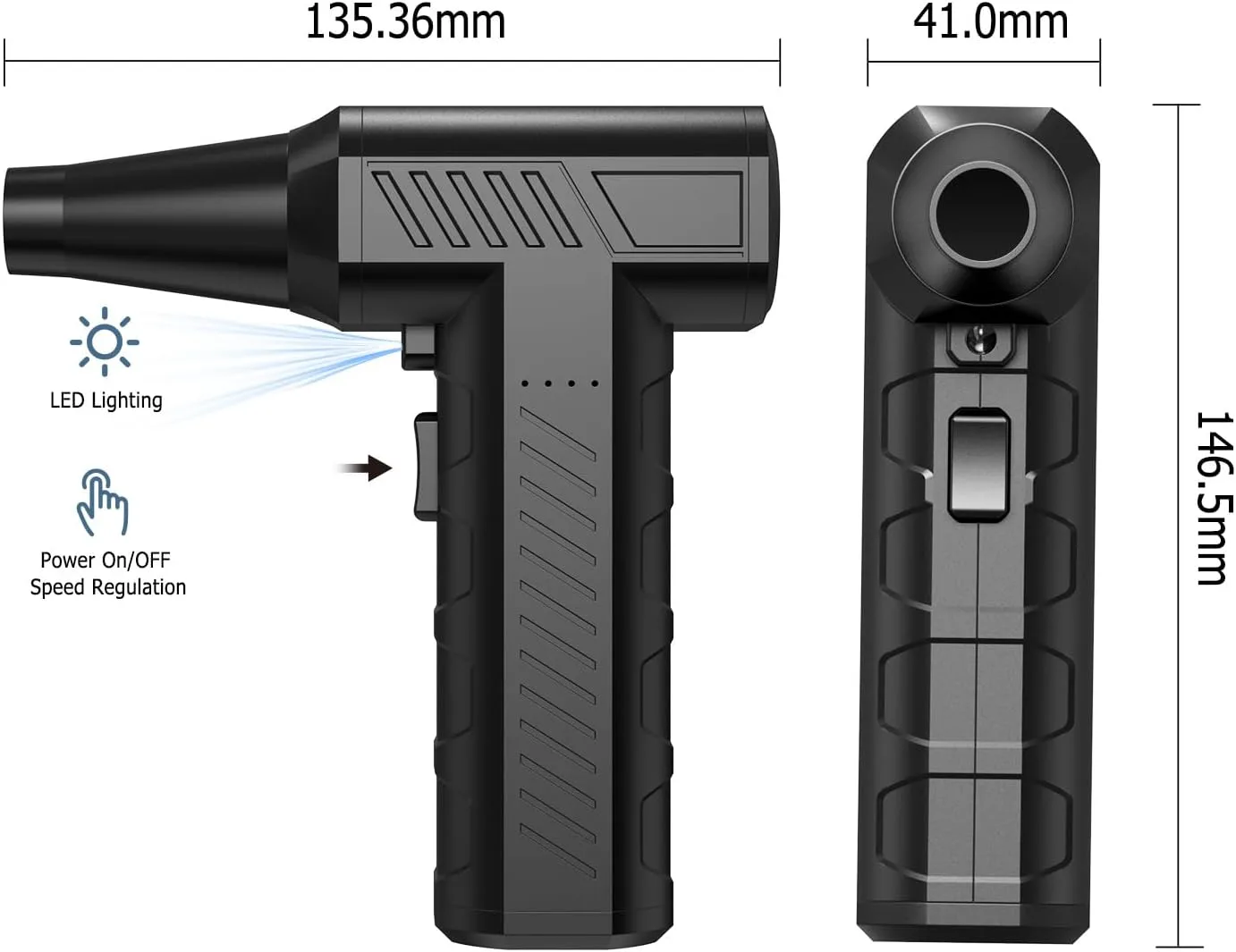 This air duster devices remover adopts the newest powerful motor technology which with speed of 150000RPM, maximum blowing force of 150G without a nozzle;with a nozzle, the blowing force about 130G. The powerful wind force can clean up dust devices easily.