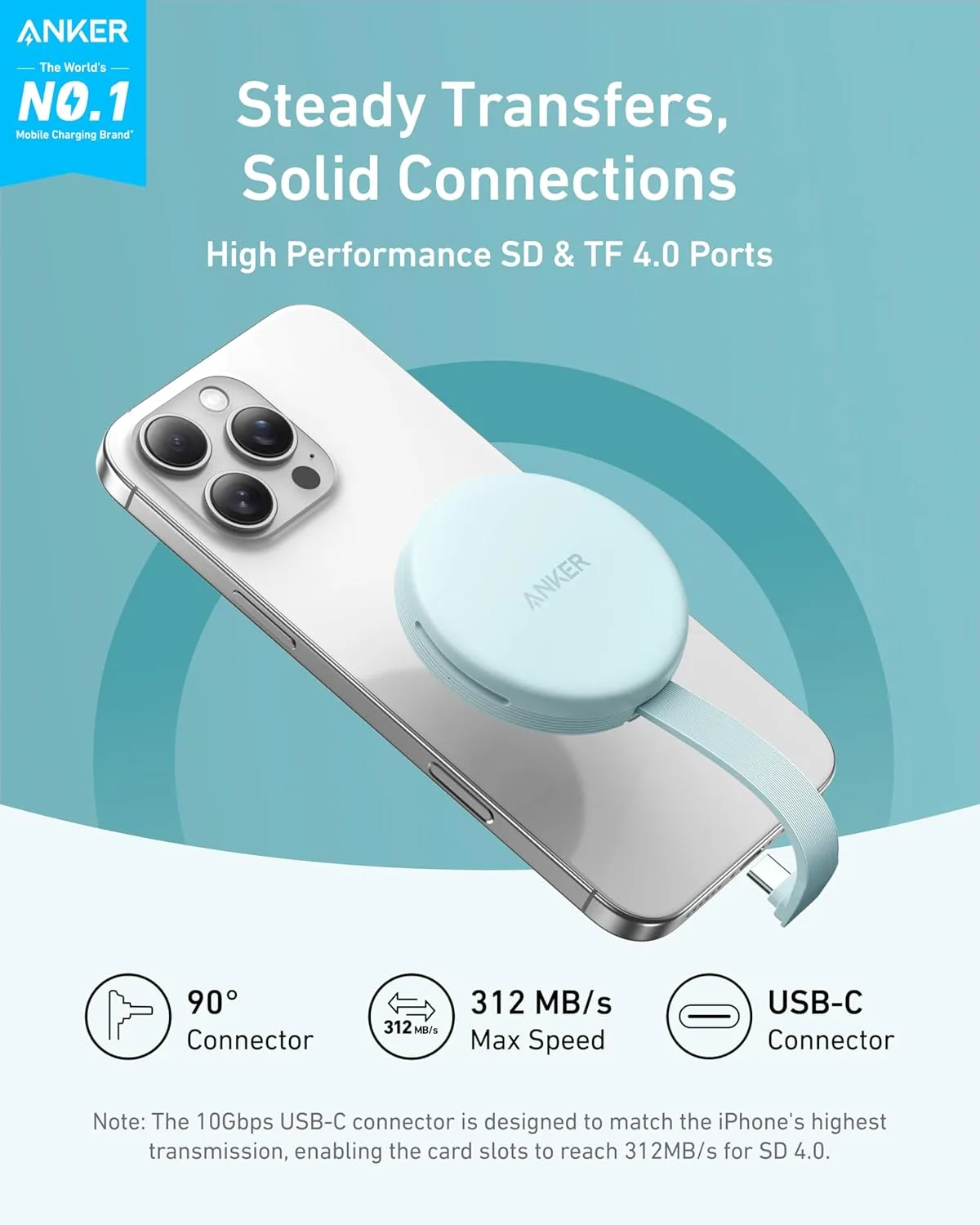 Anker MagGo USB-C Adapter, SD Card Reader for iPhone 16/15 Series, Portable Magnetic Memory Card Reader with Built-in Cable, Slot for SD&TF, 312MB/s Max Data Transfer forUSB C Devices(Green)