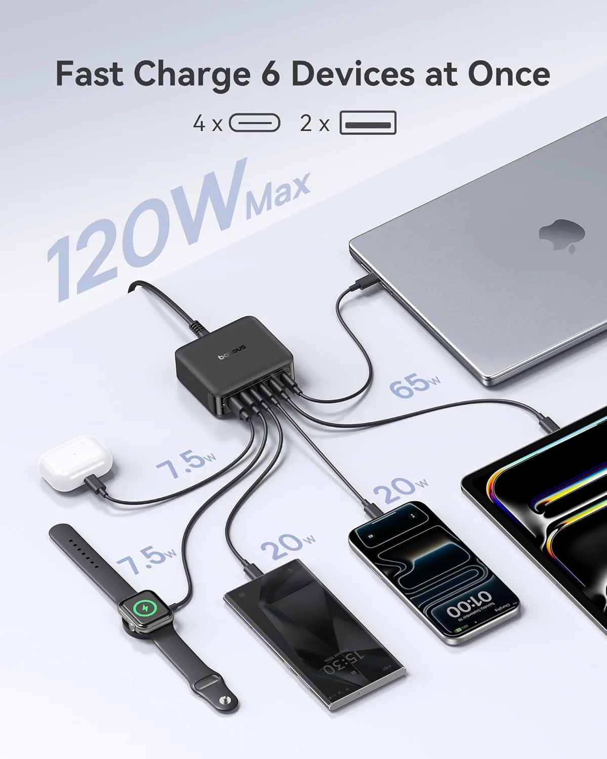 $28.49 | Baseus 6-Port up to 120W USB Charging Station w/ 5' AC Cord (4x USB-C & 2x USB-A) at Amazon