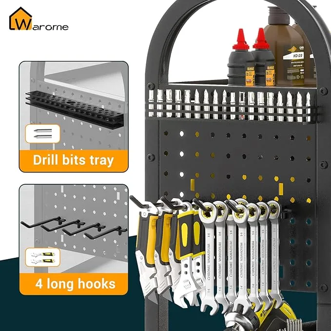3 layer tools shelves, bottom removable and storage basket, side panel pegboard design.