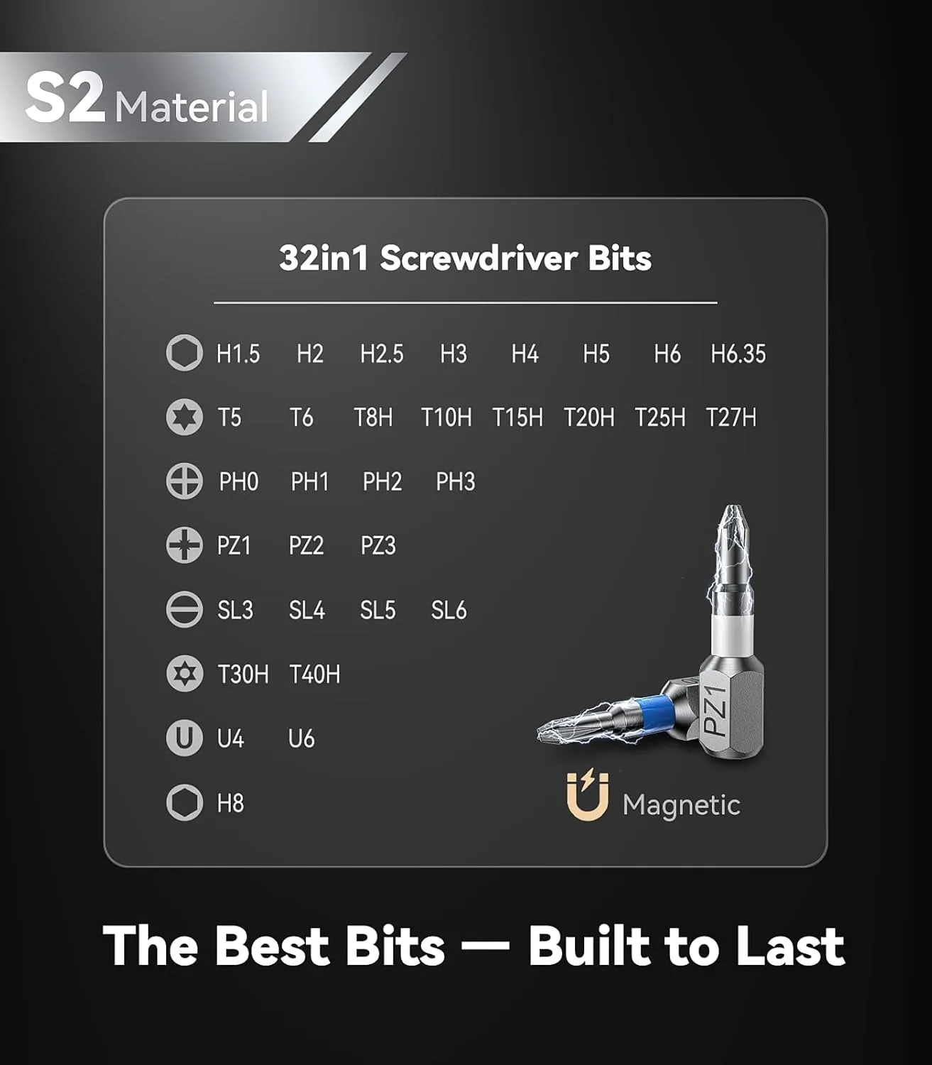 [Built to Last] All bits are made of the best S2 Steel (Steel for tanks) and the hardness can reach over HRC65°, resist abrasion, oxidation and corrosion, ensure long time use. Each bit is magnetized to securely hold screws. Covered by Wesdut's Lifetime Warranty.(It comes from our confidence in quality.)